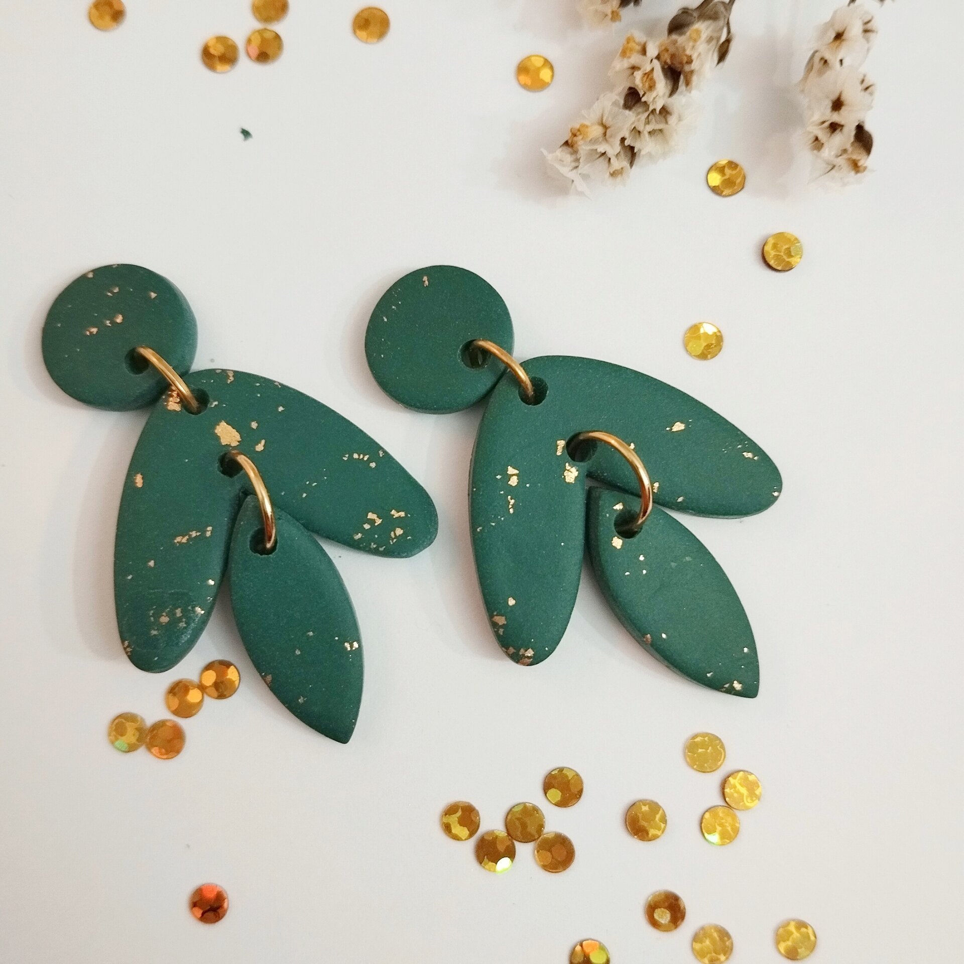 Colección Emerald, pendientes de arcilla polimérica y acero inoxidable (hipoalergénicos) hechos a mano. Colección que combina colores azul cerceta y verde botella.